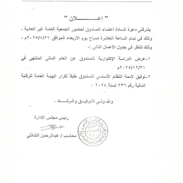 اعلان الجمعية العامة غير العاديةAdmin24 أغسطس، 2025نتشرف بدعوة سيادتكم لحضور الجمعية العامة غير العادية المزمع عقدها يوم ألأربعاء الموافق 27/8/2025 ... قراءة المزيد